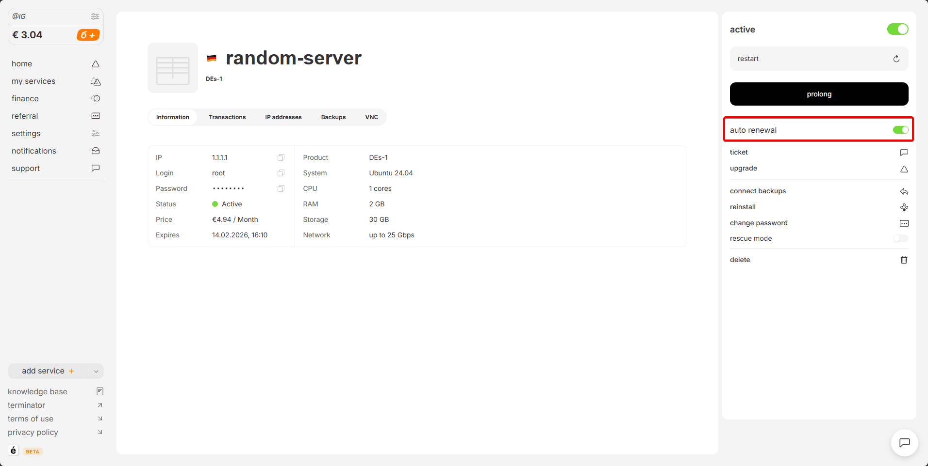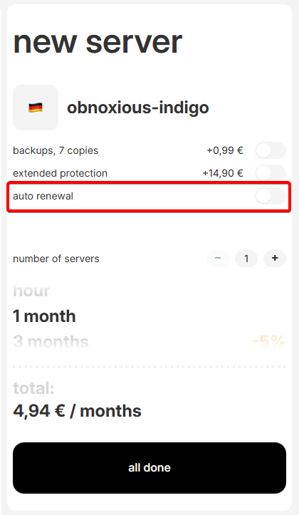 We recommend not disabling auto-renewal for critically important servers, since disabling this setting may result in losing the desired service at the end of the paid period.