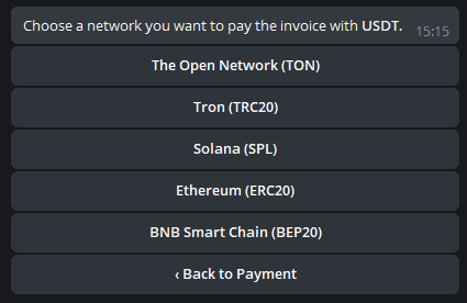 To make a payment, you must have a currency (USDT) on your CryptoBot balance, or have the specified currency on an external wallet. If this is the case, then click Pay, after which the bot will ask which network we have USDT on.: