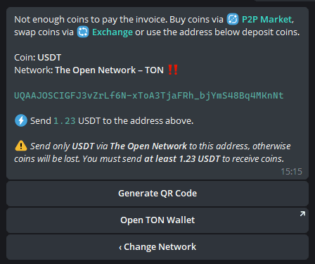 Before using this method of replenishment, it is necessary to replenish the internal wallet of this bot using Exchange or P2P (recommended), or make a payment using an external crypto wallet by transferring the cryptocurrency to the address specified in the bot. In the screenshot below, you can see that the bot is waiting for replenishment from USDT on the TON network.
