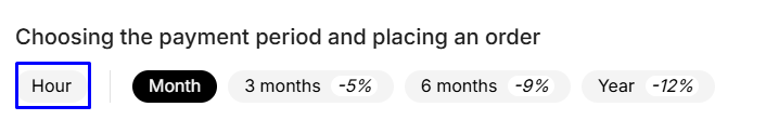 After starting hourly server rental, payment will be charged hourly, starting from the 60th minute from the moment of purchase. And in case the auto-renewal service is enabled, which we have already talked about earlier, the fee will be charged until: