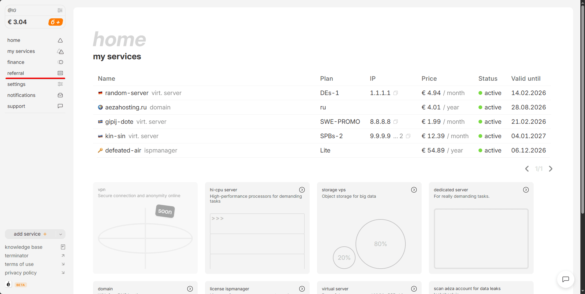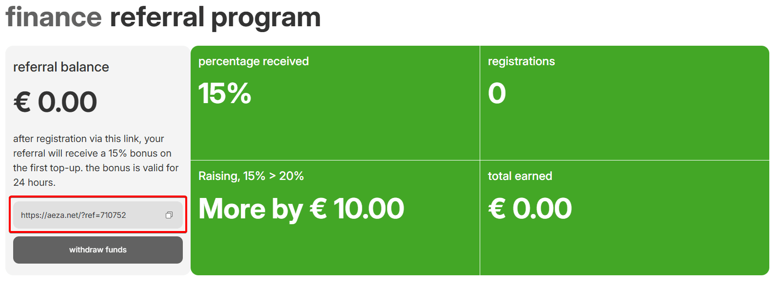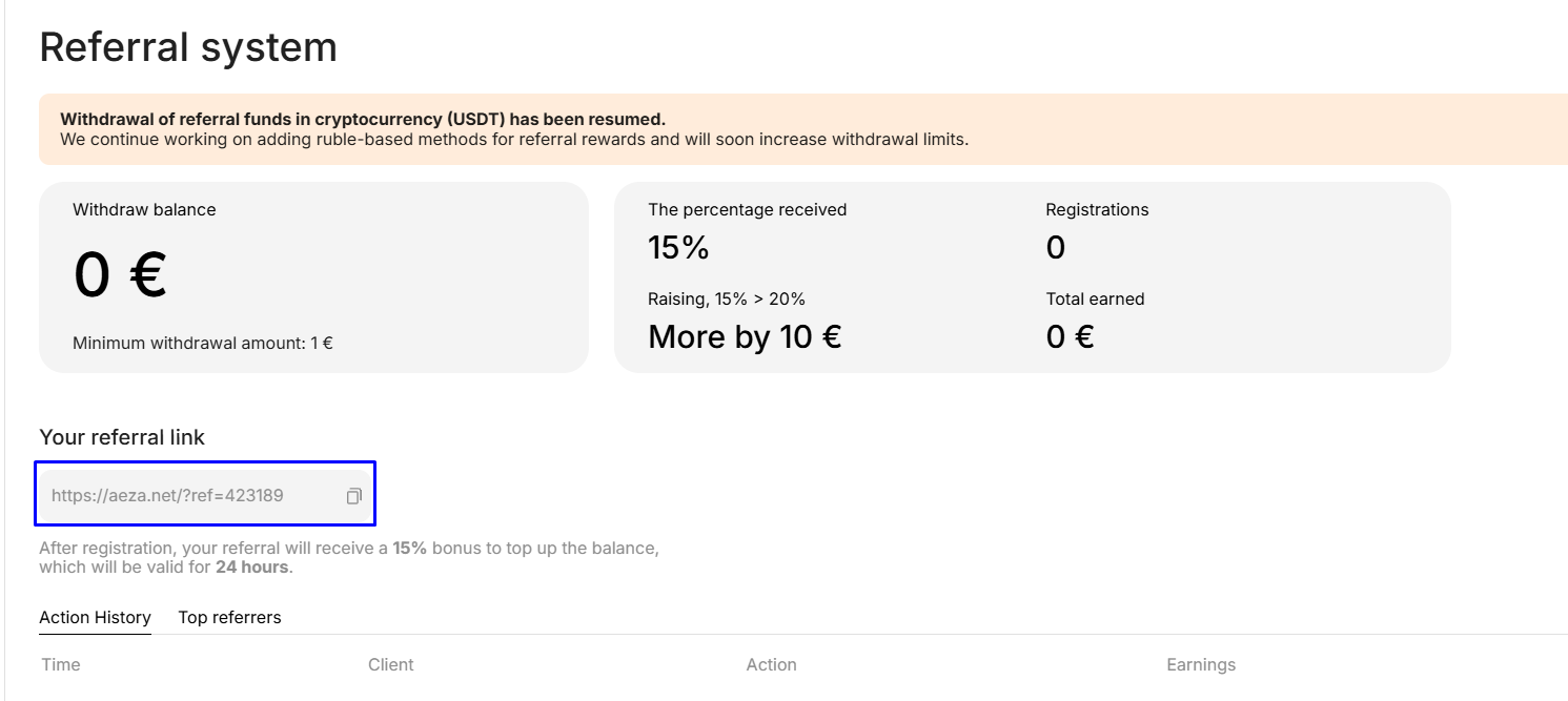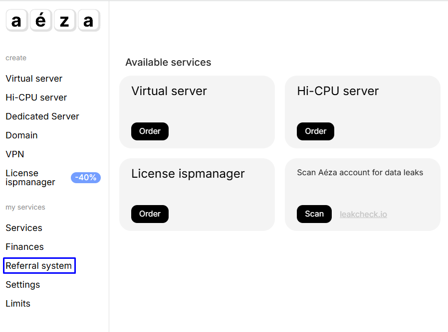 Referral system is a system of monetary rewards for our customers who recommend Aéza to friends and colleagues, promote their referral link on their own websites, targeted advertising and even offline types of promotion.