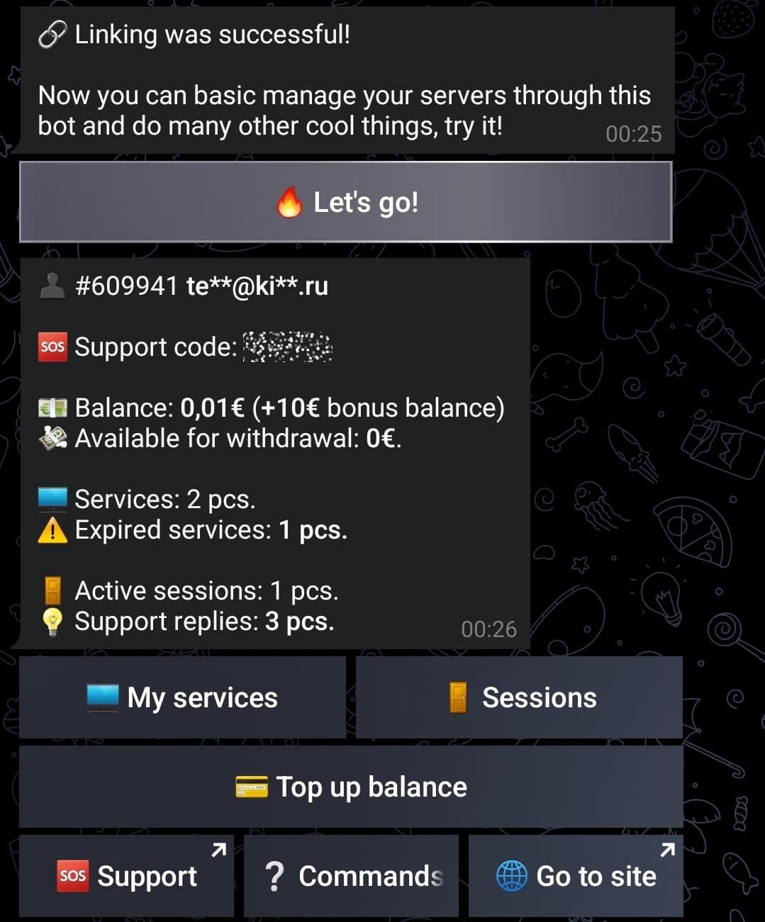 A linked Telegram account allows you to receive notifications in Telegram, both promotional and all important ones related to your server, such as: about service renewal, receiving complaints, stopping and restarting services. In addition, this will allow you to manage your account directly from Telegram: top up balance, delete and reinstall your services and much more.