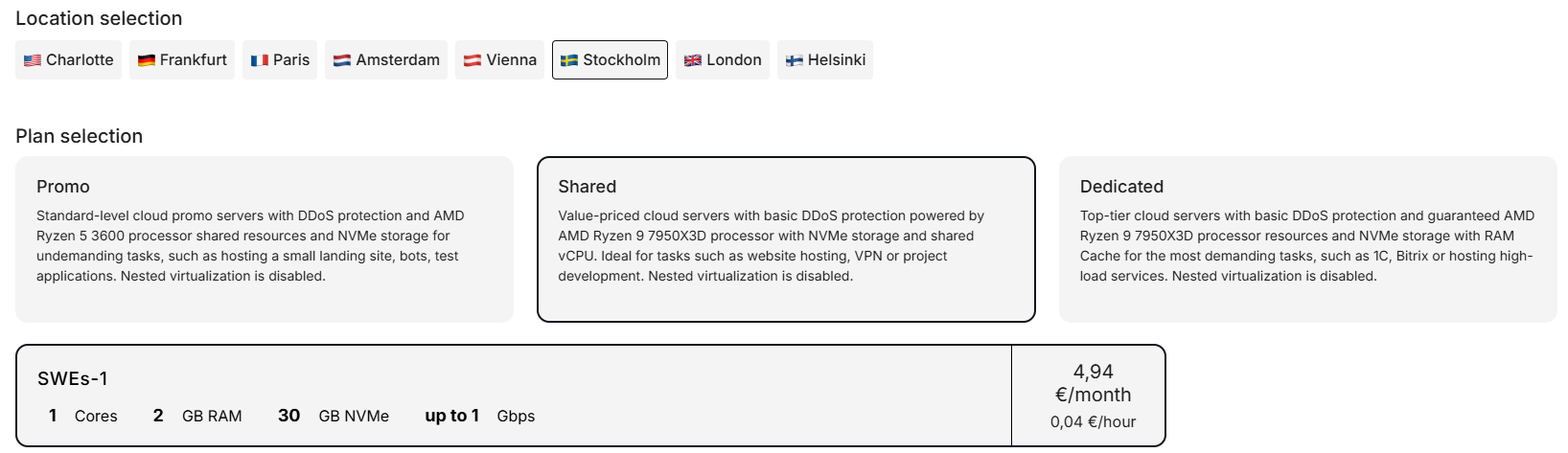 For this, we need to buy the necessary server in the desired location. In our case, it will be the basic plan SWEs-1 in Sweden