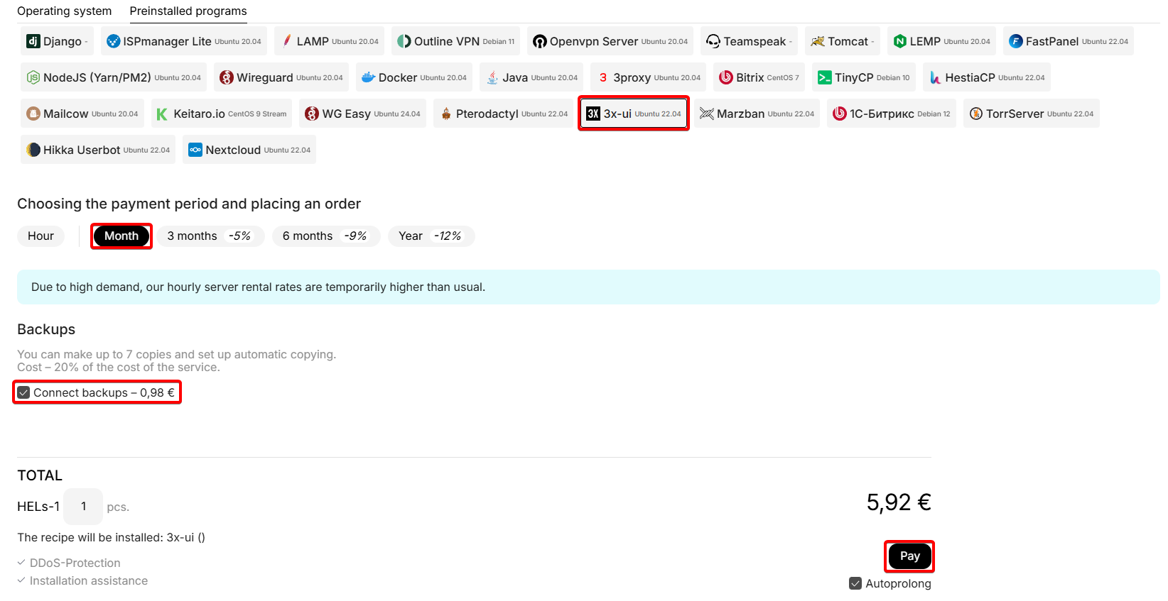 Set the desired rental period by hours or months, disable the "Backups" service if necessary and click the pay button