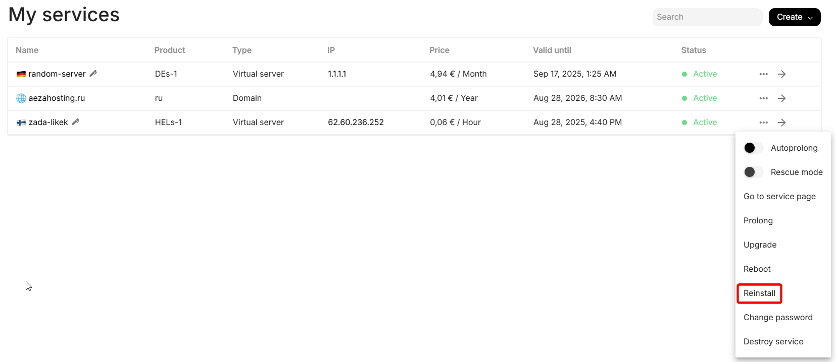 Go to the services section and click the three dots icon to the right of the already purchased server, select the reinstall option: