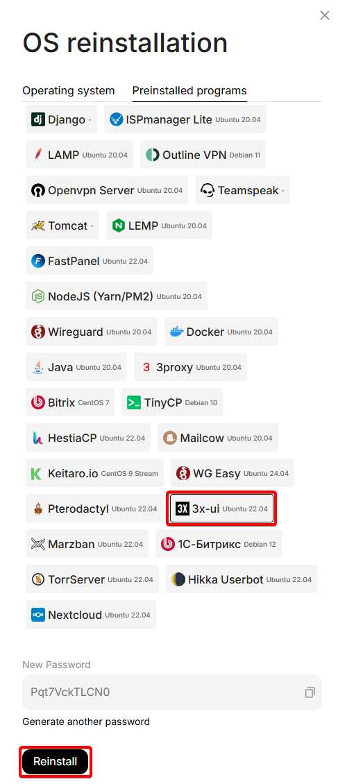 Now your server will be reinstalled, after which it will be ready to create a connection config. We will tell you about its creation in point 2 ("Accessing the 3x-ui panel and creating a user key")