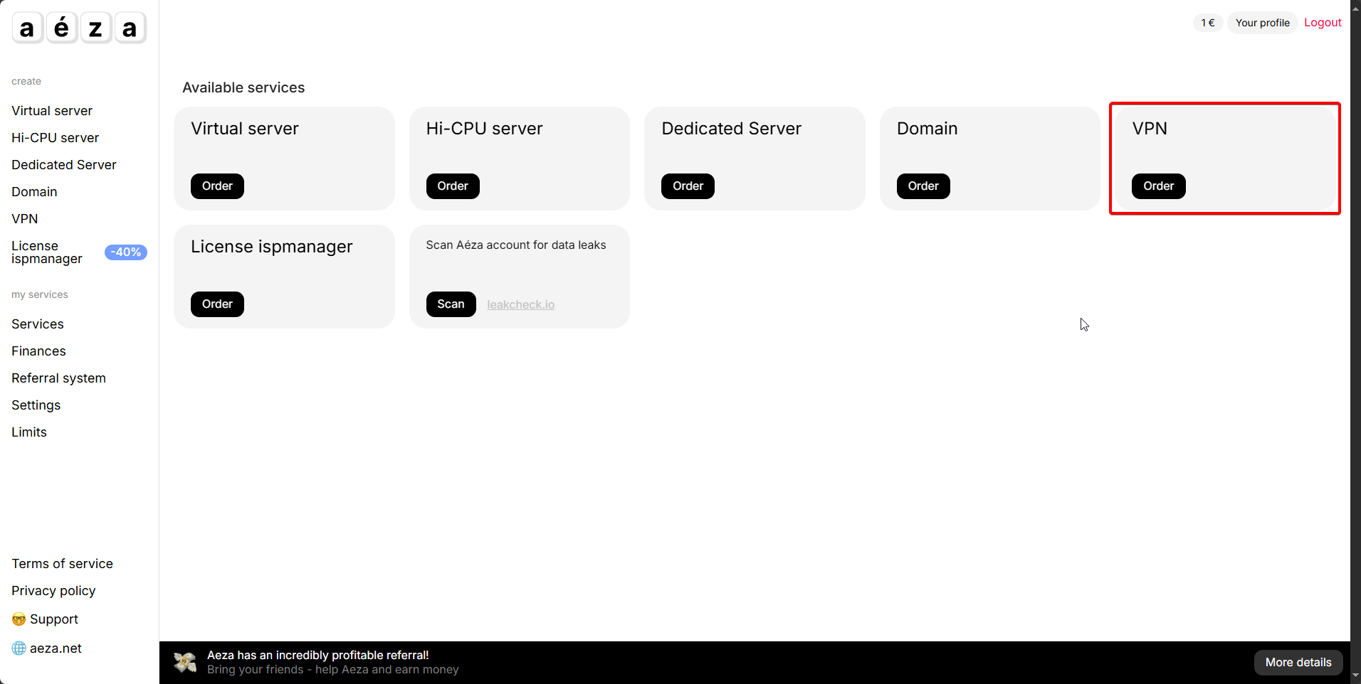 Go to the main page of the personal account and select VPN