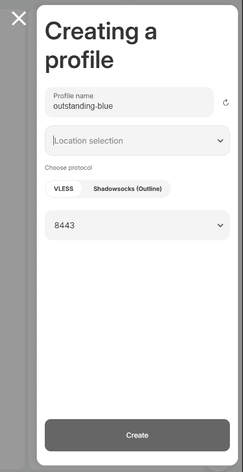 After selecting a profile, you will see a popup window where you can configure your profile on the selected location. Choose one of the one available VPN protocols: VLESS. Next, we will provide more detailed information about each of them.