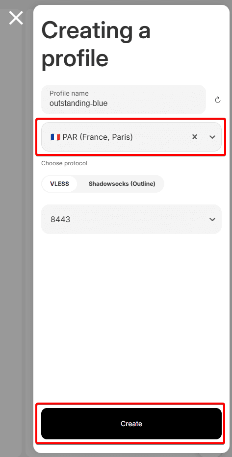 For example, let's choose the France location, VLESS protocol, port 8443, then click the create button.