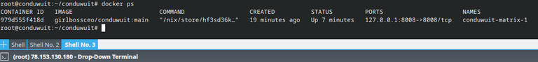 To do this, it's enough to go to the conduwuit folder where you created two files (in our case, this is the /root/conduwuit/ directory, you can go to it with the command: cd /root/conduwuit/) and execute the command: