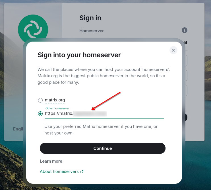 Then enter the address of your domain that you used to deploy your own Conduwuit server and confirm with the "Continue" button:
