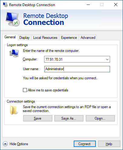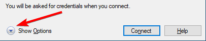 The username Administrator is specified by default. Next, we open additional settings by clicking the Show options button.