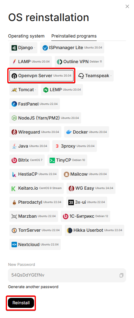 The OS will be reinstalled according to the specified OS in the preinstalled software script, in this case Ubuntu 22.04 + OpenVPN will be installed