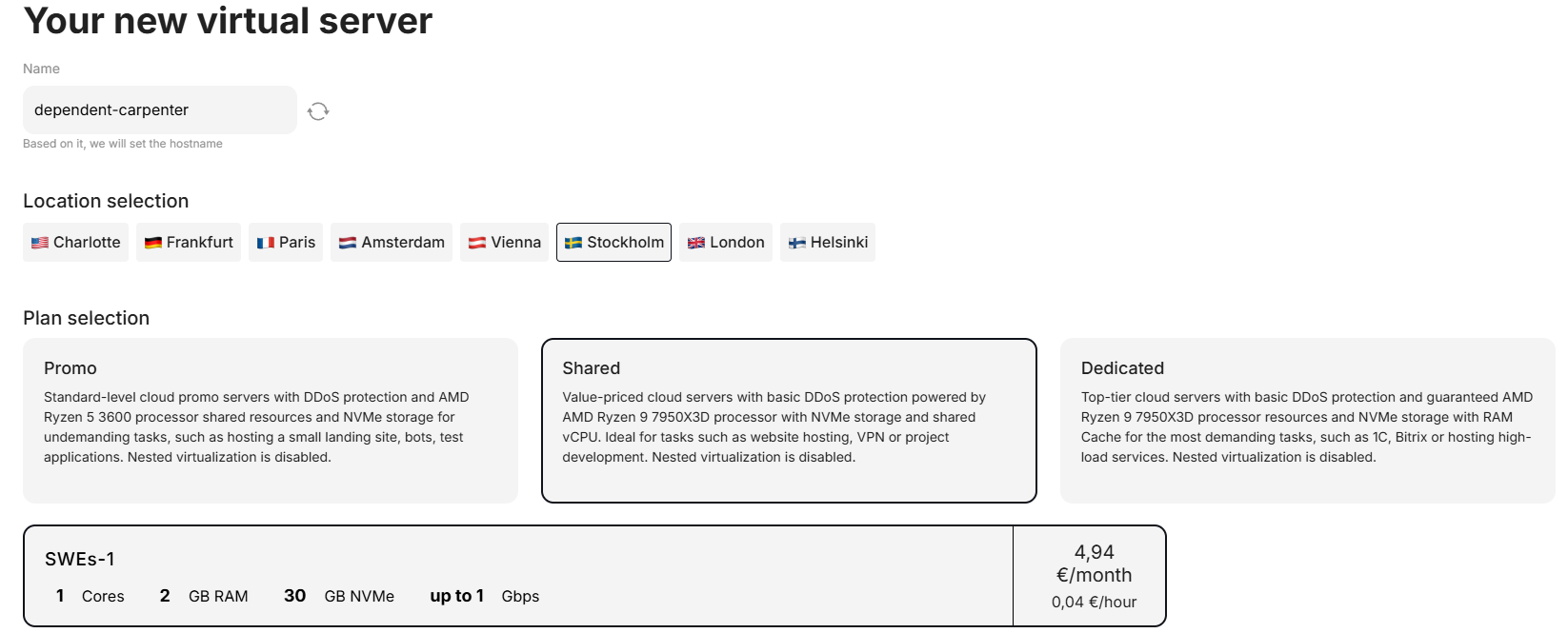 For this, we need to buy the necessary server in the desired location. In our case, it will be the basic plan SWEs-1 in Sweden:
