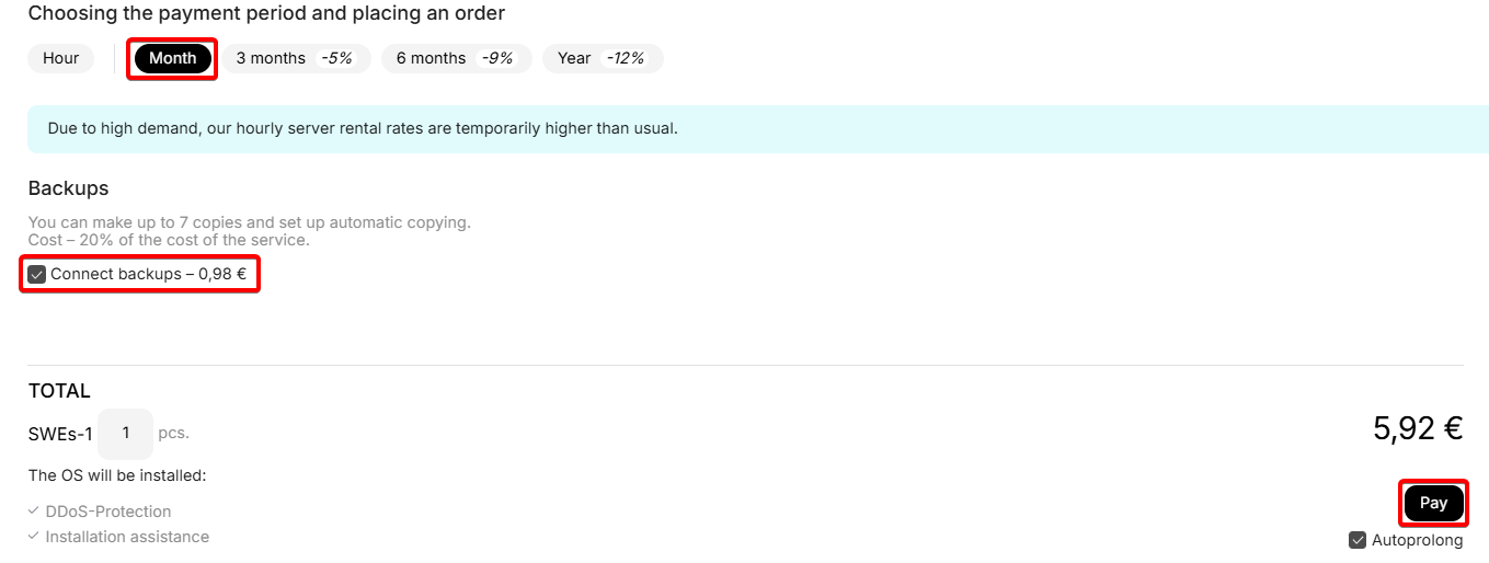 Set the desired rental period by hours or months and click the pay button: