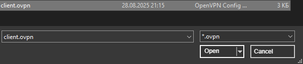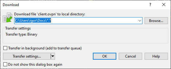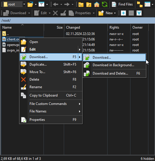 After connection, click on the client.ovpn file and press F5, or right-click on it and download it with the "get" button:
