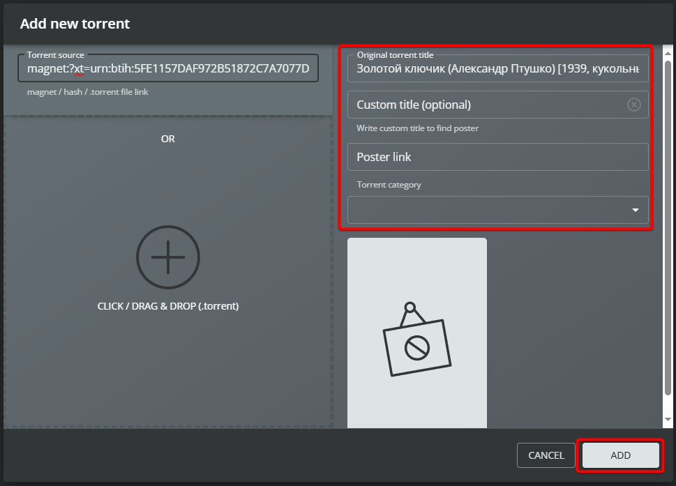 After adding the torrent file, you can change the file name on your server, as well as set a cover for greater comfort in using TorrServer. Their presence is not mandatory. Click the "Add" button.