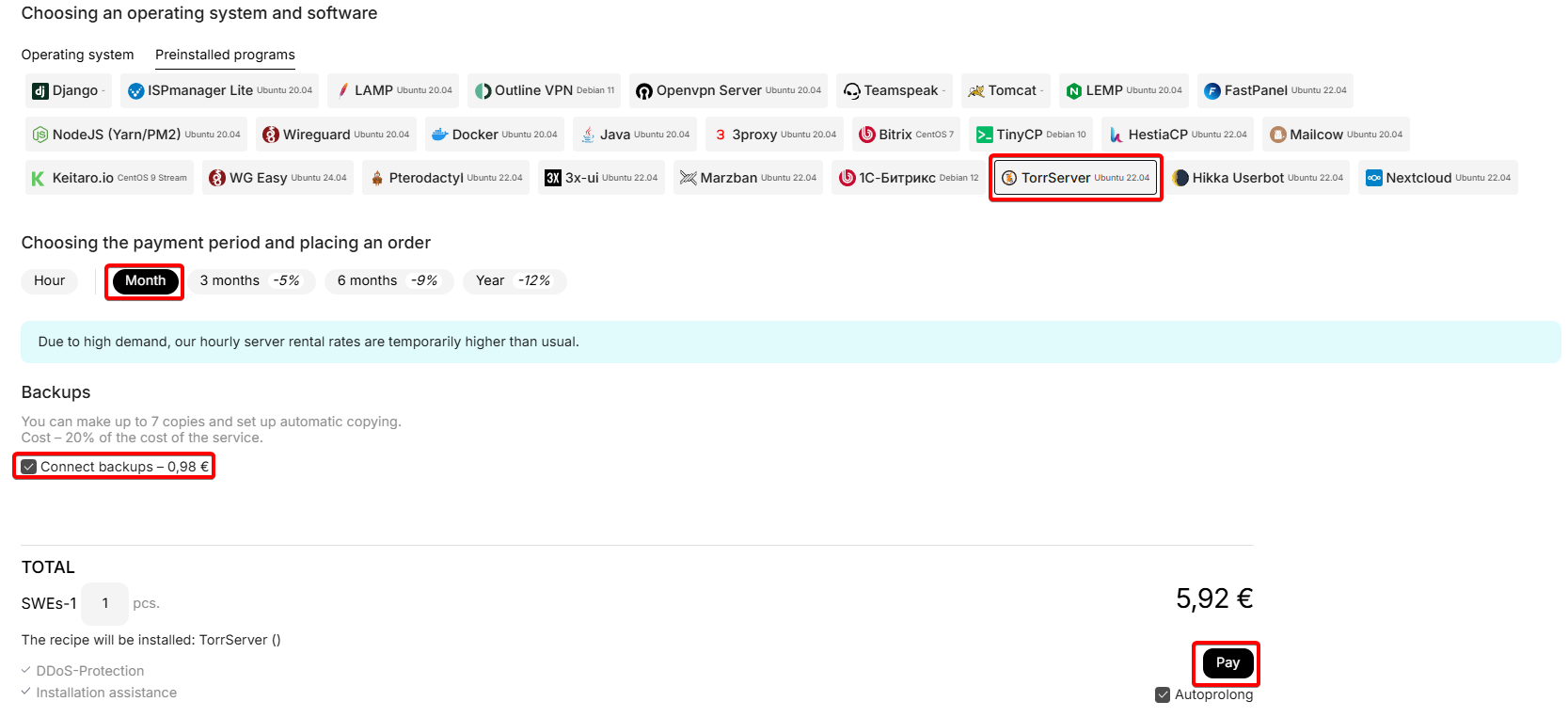 Set the desired rental period by hours or months, disable the "Backups" service if necessary and click the pay button