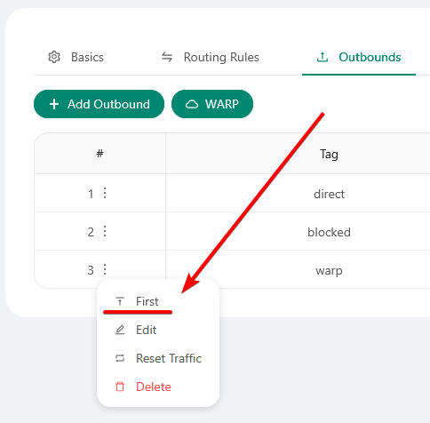 Scroll to the outbounds section, add the necessary settings to the beginning of the block after the square bracket