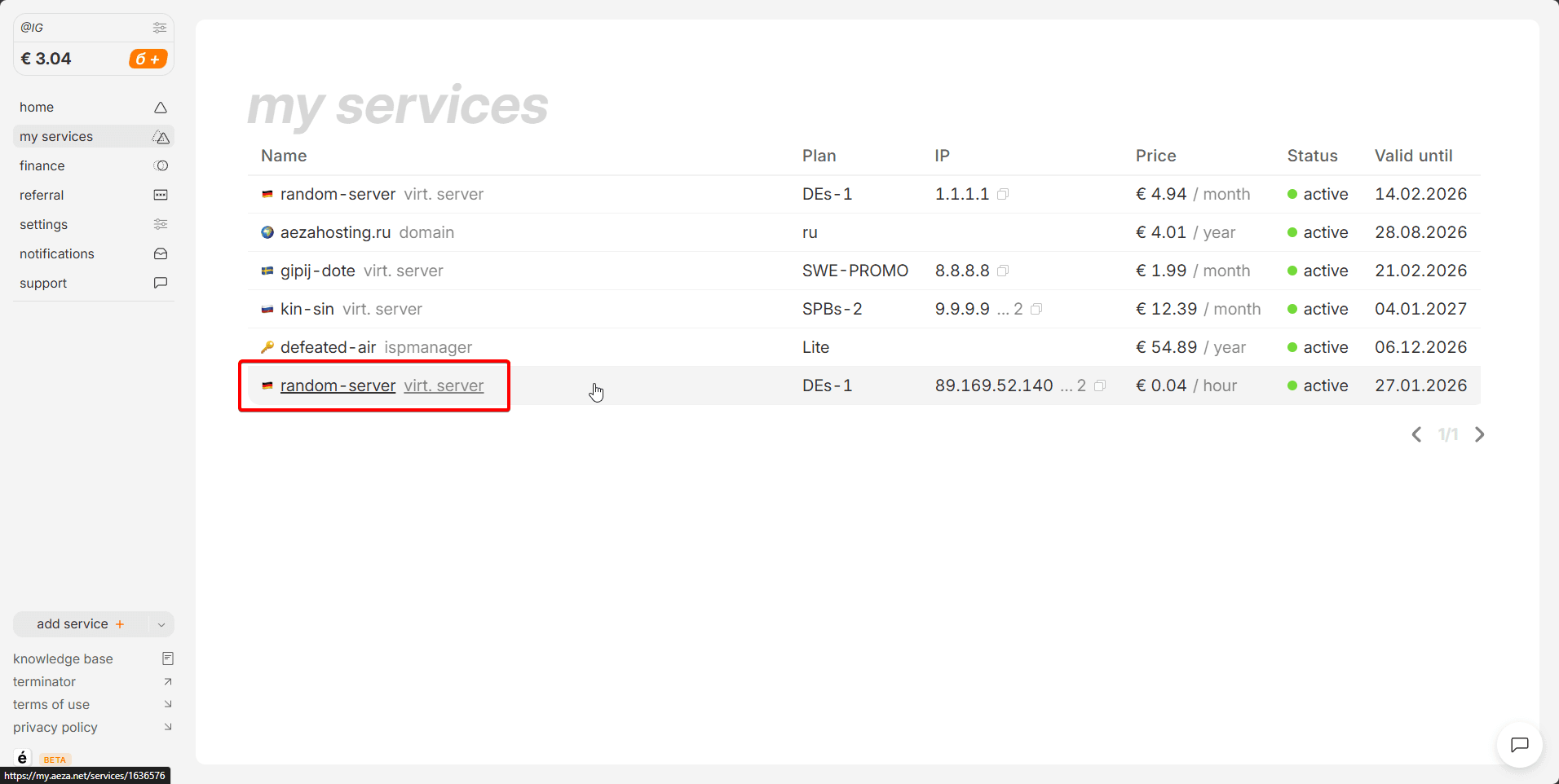 Go to the "services" section and click the arrow next to the server to which we want to add an additional IP address.: