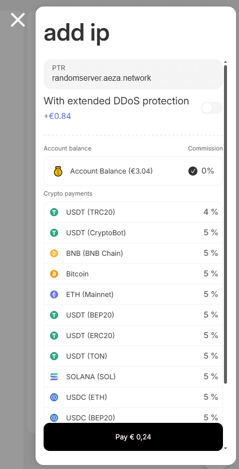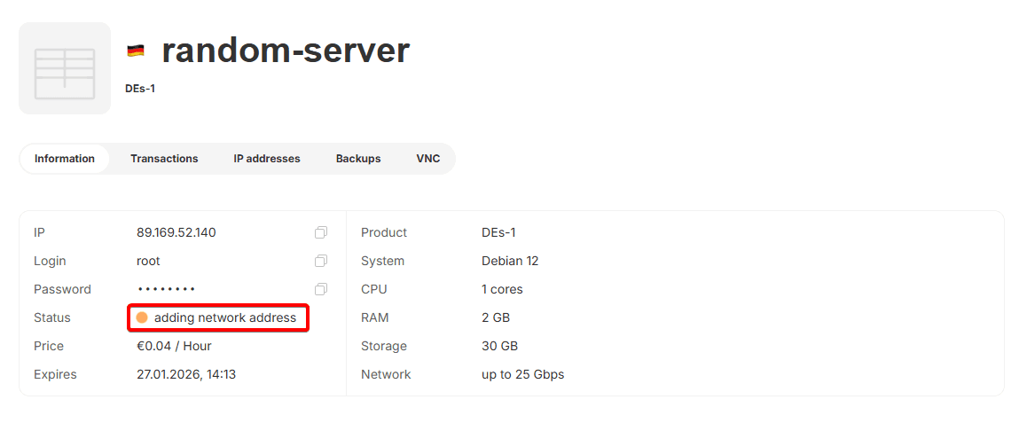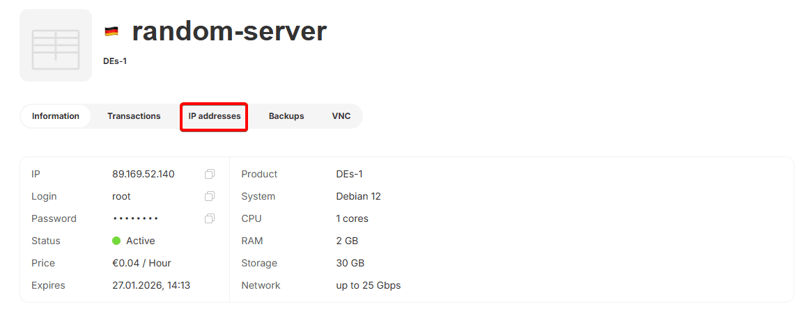 The price of the additional IP address will be calculated based on the paid period of your server hosting tariff.