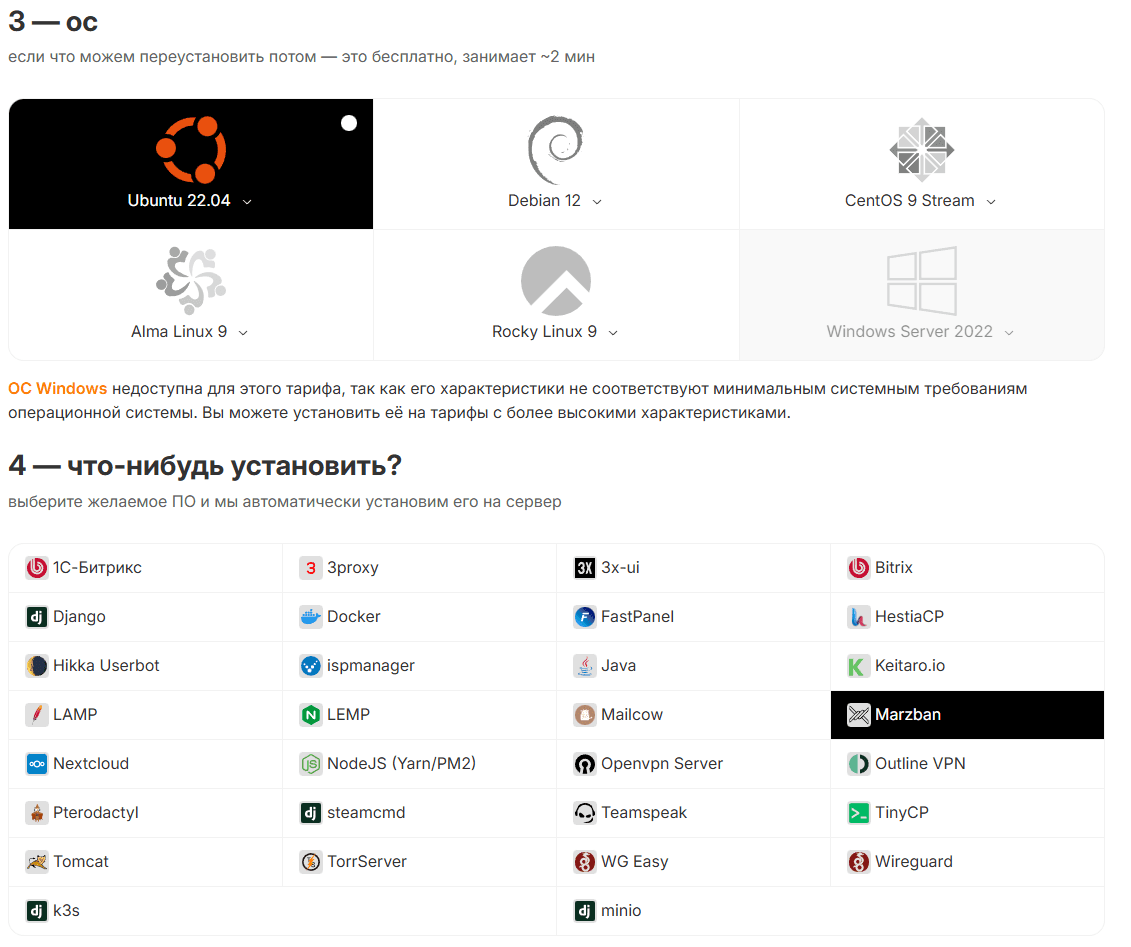Установка ОС будет произведена согласно указанной ОС в скрипте предустановленного ПО, в данном случае будет установлен Ubuntu 22.04 + Marzban