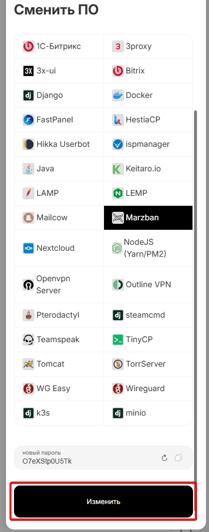 Выбираем скрипт Marzban, нажимаем изменить