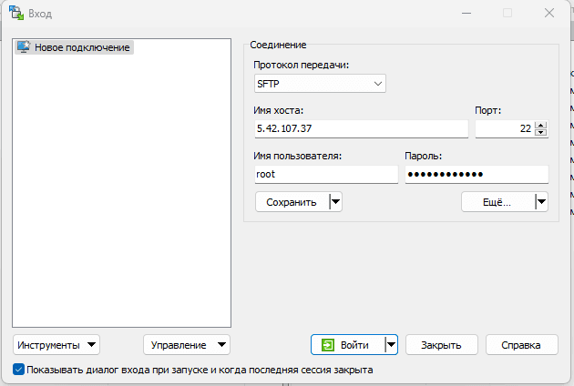 Подключаемся к серверу посредством WinSCP (или другого удобного вам SFTP клиента) и указанием IP, логина и пароля из личного кабинета, либо письма с вашей почты.\