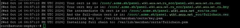--fullchain-file /var/lib/marzban/certs/fullchain.pemПосле выполнения команд вы увидите подобное сообщение о успешном выпуске сертификата: