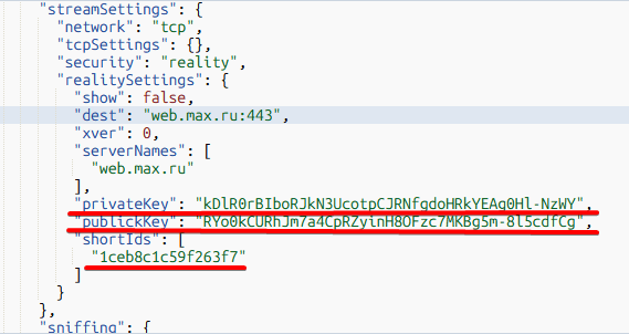Нам необходимо скопировать параметры Private key, Publick key и shortIds после чего заменить их в панели