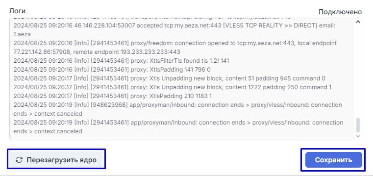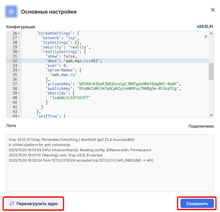 После внесения изменений, необходимо их сохранить и перезагрузить ядро