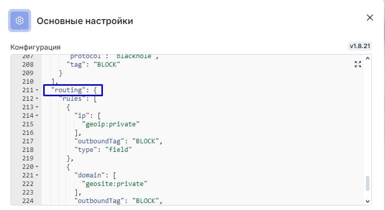 Наблюдаем что в блоке "Inbounds" только Shadowsocks TCP, добавим VLESS TCP Reality в начало блока после квадратной скобки