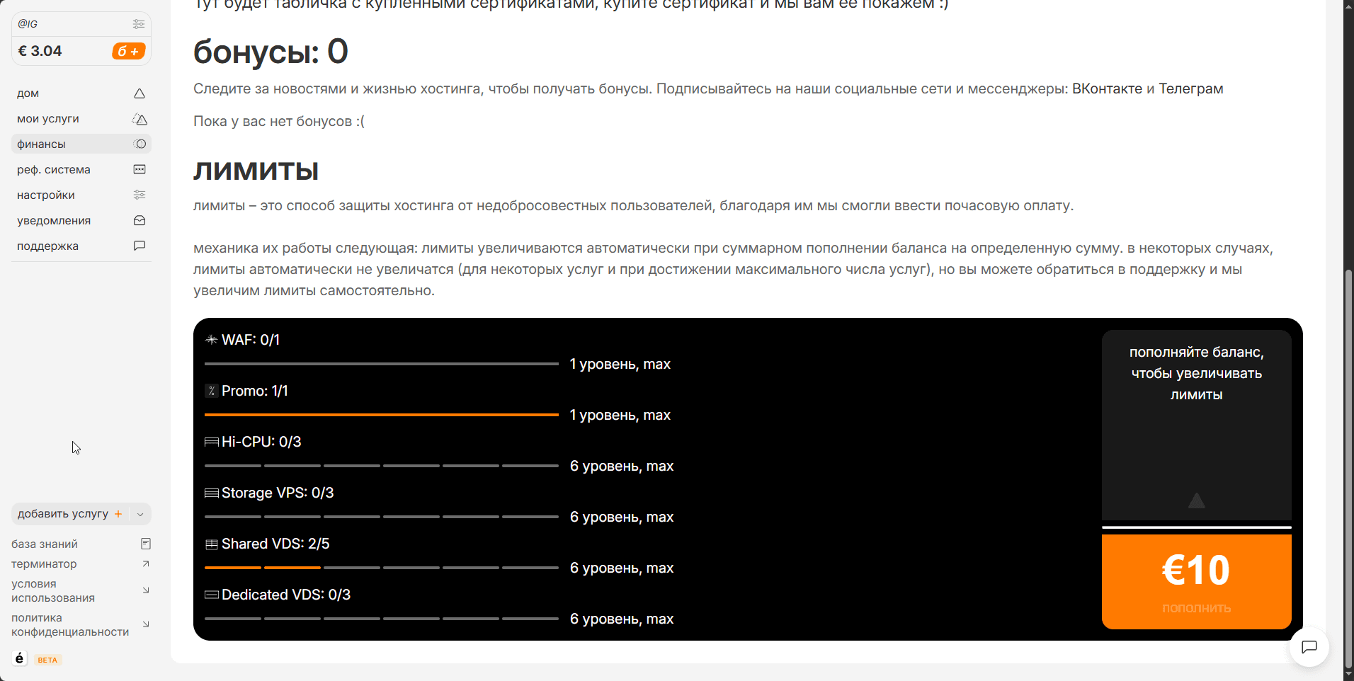 Перейдя в этот раздел, вы сможете изучить ограничения каждого вида предоставляемых услуг и требования, которые позволят вам превысить текущие значения.