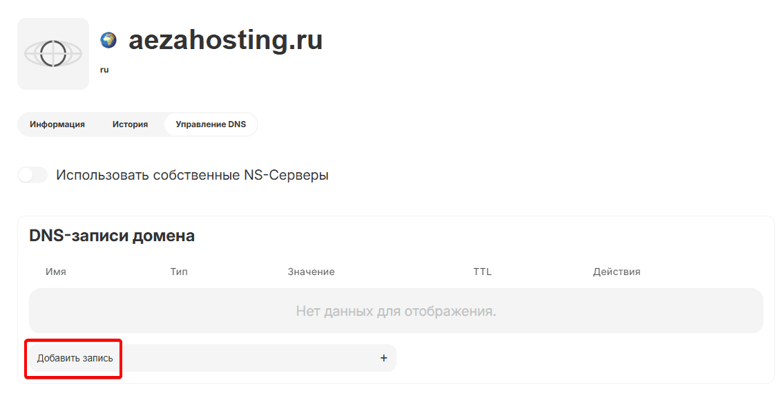 Нажмём на кнопку для создания DNS записи: