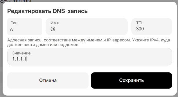 Введём адрес своего сервера в «А» запись нашего домена: