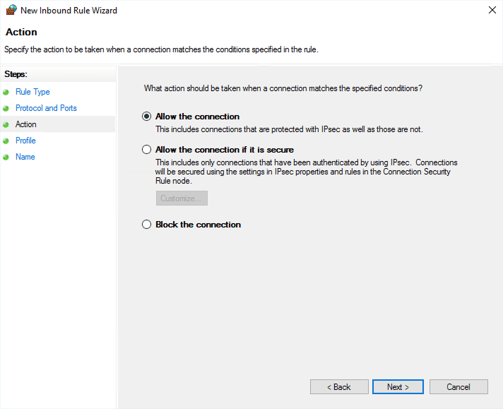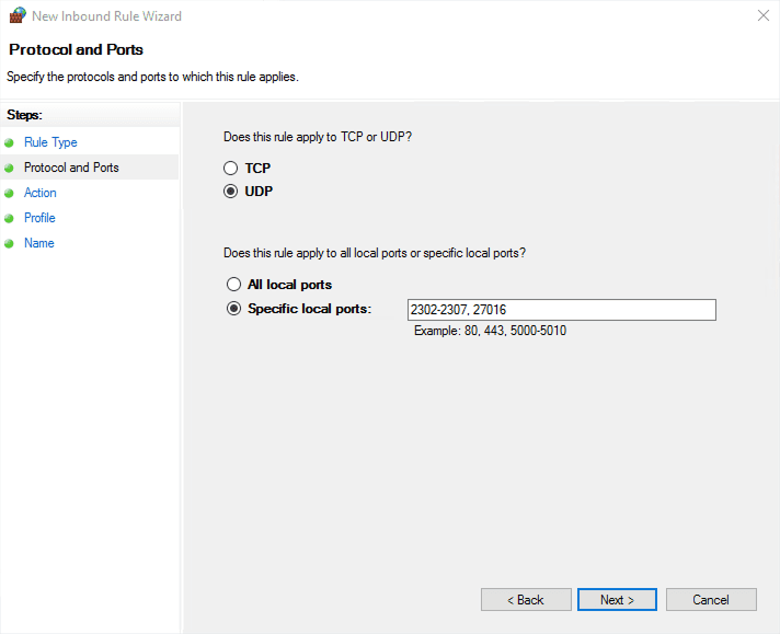 Создаем новое правило для входящих подключений (Inbound Rules) по протоколу UDP для портов 2302-2307, 27016