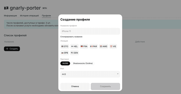 После выбора профиля вы увидите всплывающее окно, в котором вы сможете настроить ваш профиль на выбранной локации. Выберите один из двух доступных протоколов VPN: VLESS или Outline. Далее, мы предоставим более подробную информацию о каждом из них.