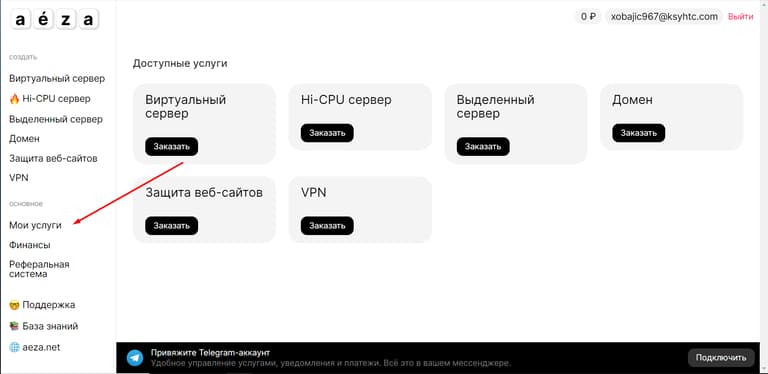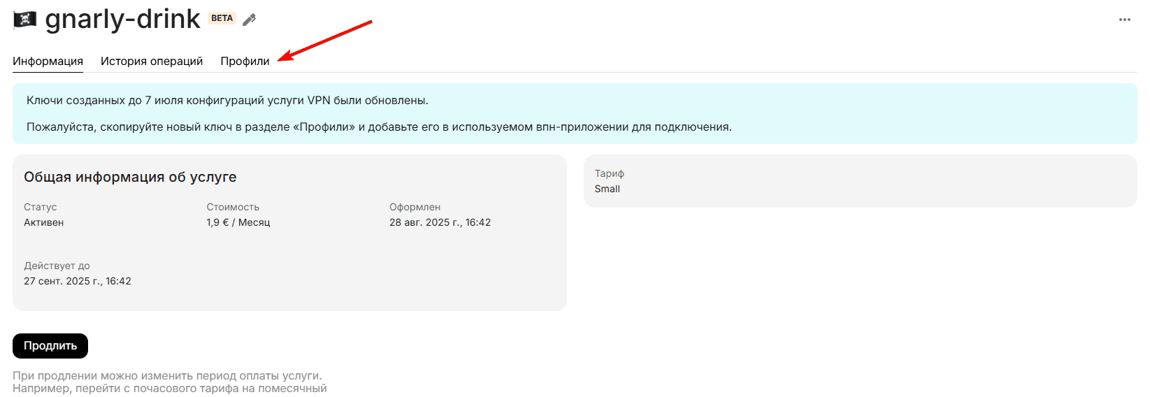 Откройте раздел "Мои услуги" и кликните на названии услуги «VPN».