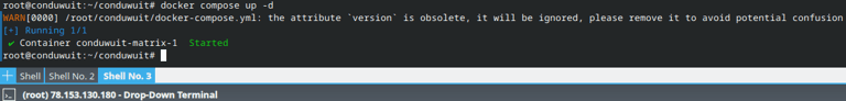 После выполнения конфигурирования сервера, выпуска SSL-сертификата и развертывания прокси-сервера мы можем запустить наш docker-контейнер с Conduwuit.