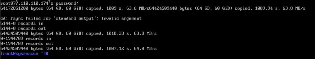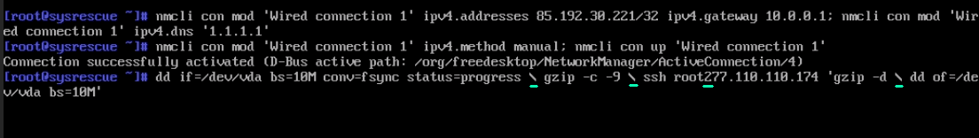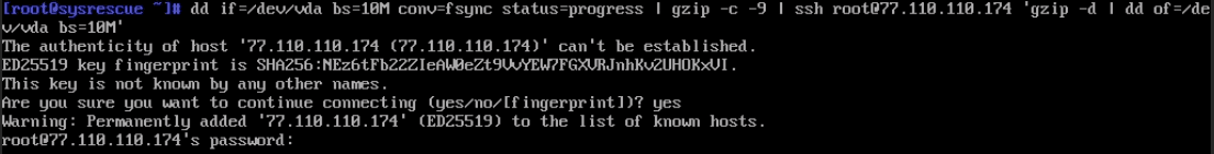 dd if=/dev/vda bs=10M conv=fsync status=progress | gzip -c -9 | ssh root@NEW_SERVER_IP 'gzip -d | dd of=/dev/vda bs=10M'С помощью стрелок и Del/Backspace редактируем команду. В данном случае символы “@” и “|” вставились как “2” и “\”, необходимо их заменить на корректные.