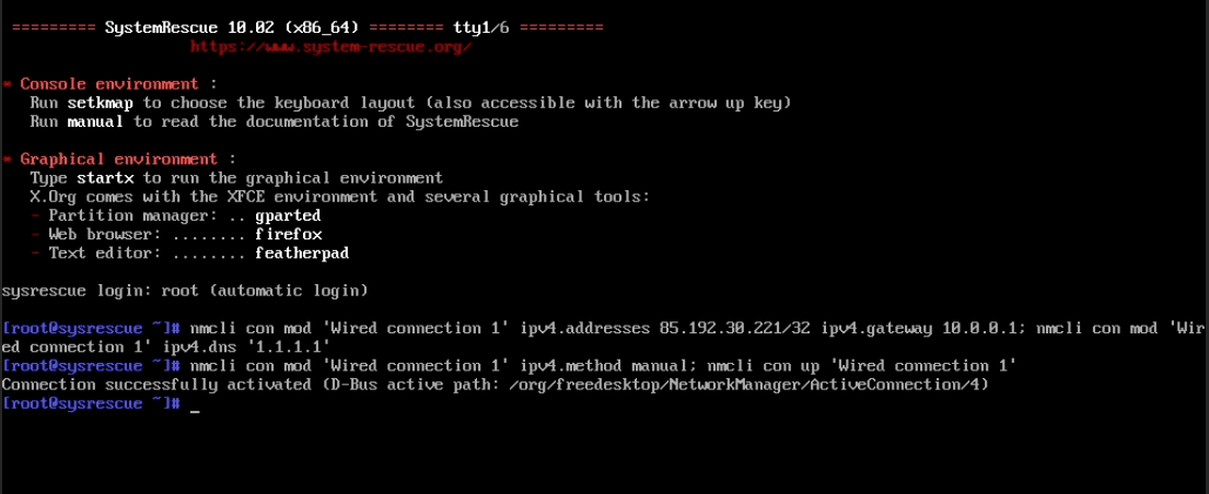 nmcli con mod "Wired connection 1" ipv4.addresses NEW_SERVER_IP/32 ipv4.gateway 10.0.0.1; nmcli con mod "Wired connection 1" ipv4.dns "1.1.1.1"