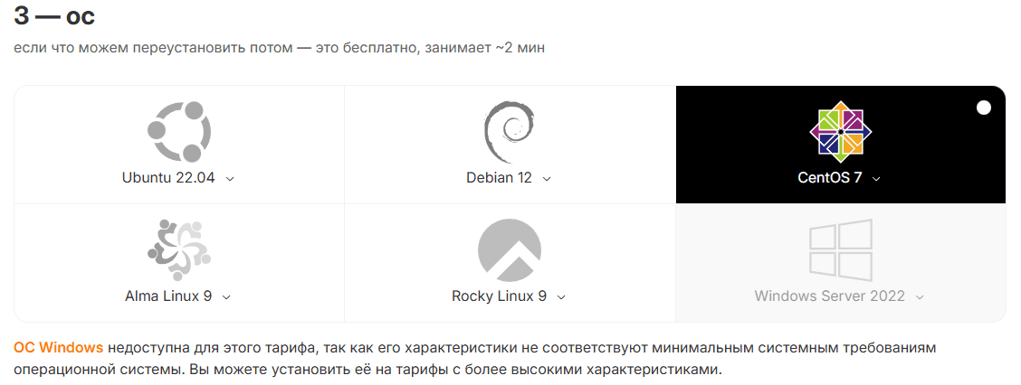При заказе услуги необходимо также выбрать ОС CentOS 7, в которой будет происходить работа по непосредственно дальнейшему развертыванию образа CHR.