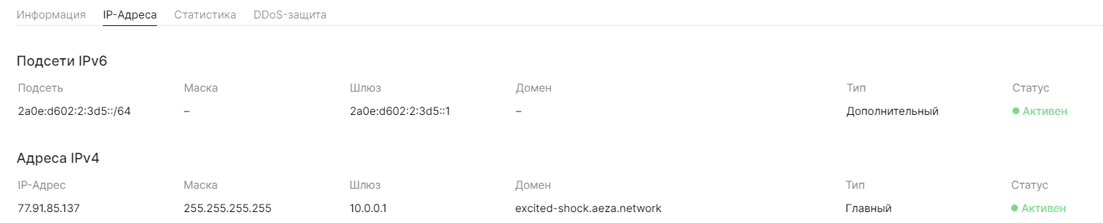 После того, как был изменен пароль суперпользователя, мы можем начать конфигурацию сети. Все требуемые сетевые параметры (IP-адрес, шлюз и маска) указаны в личном кабинете на странице услуги (в подразделе "IP-Адреса"):