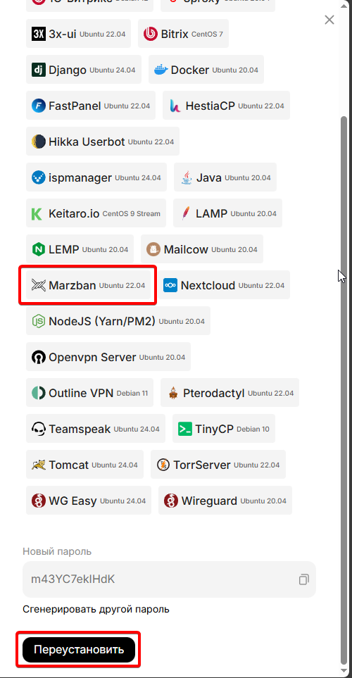 Выбираем скрипт Marzban, копируем новый пароль от сервера, нажимаем переустановить