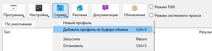 - Вставьте её в Nekoray, используя сочетание клавиш Ctrl + V или через меню: