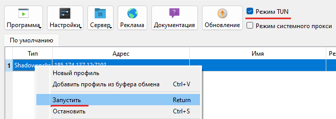 Активация режима TUN и запуск:
