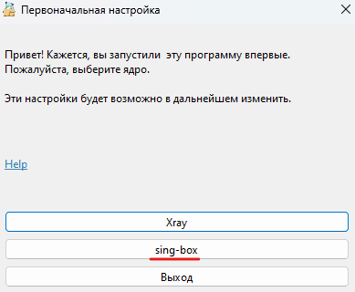 При первом запуске обязательно выберите ядро sing-box. Это необходимо для корректной работы.