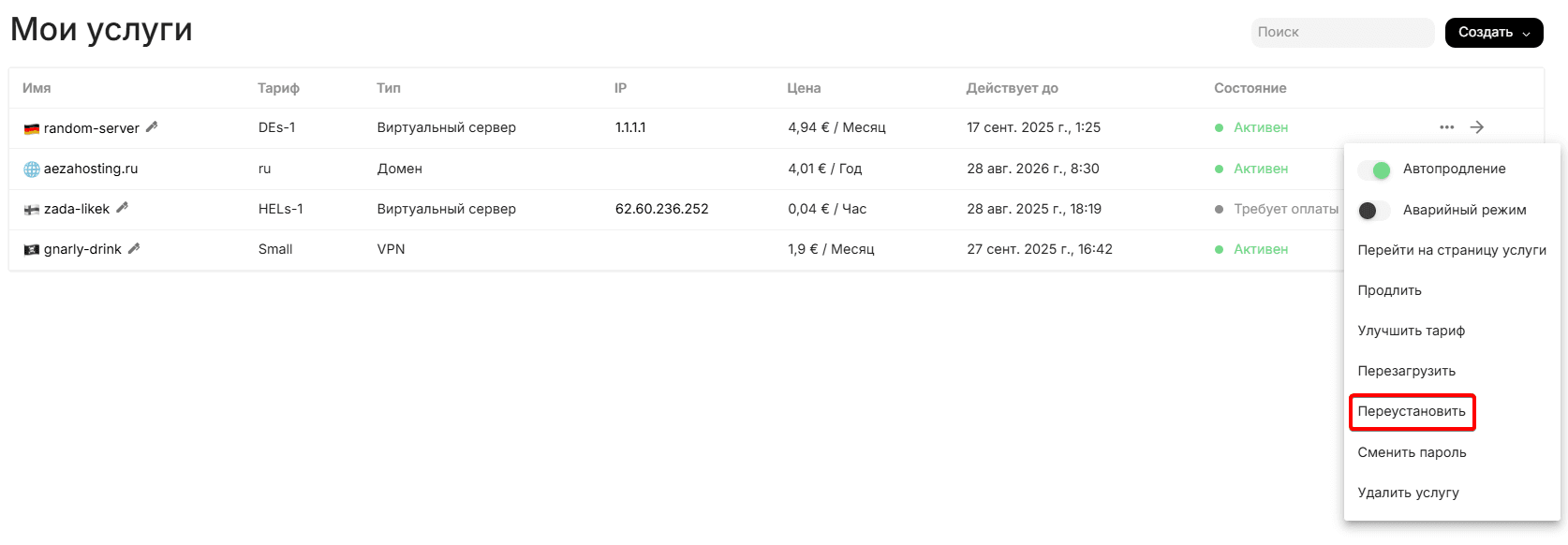 Перейдём в раздел услуг и нажмём иконку троеточия справа от уже купленного сервера, выберем пункт переустановить