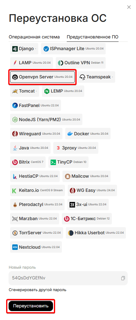 Выбираем скрипт OpenVPN, копируем новый пароль от сервера, нажимаем переустановить
