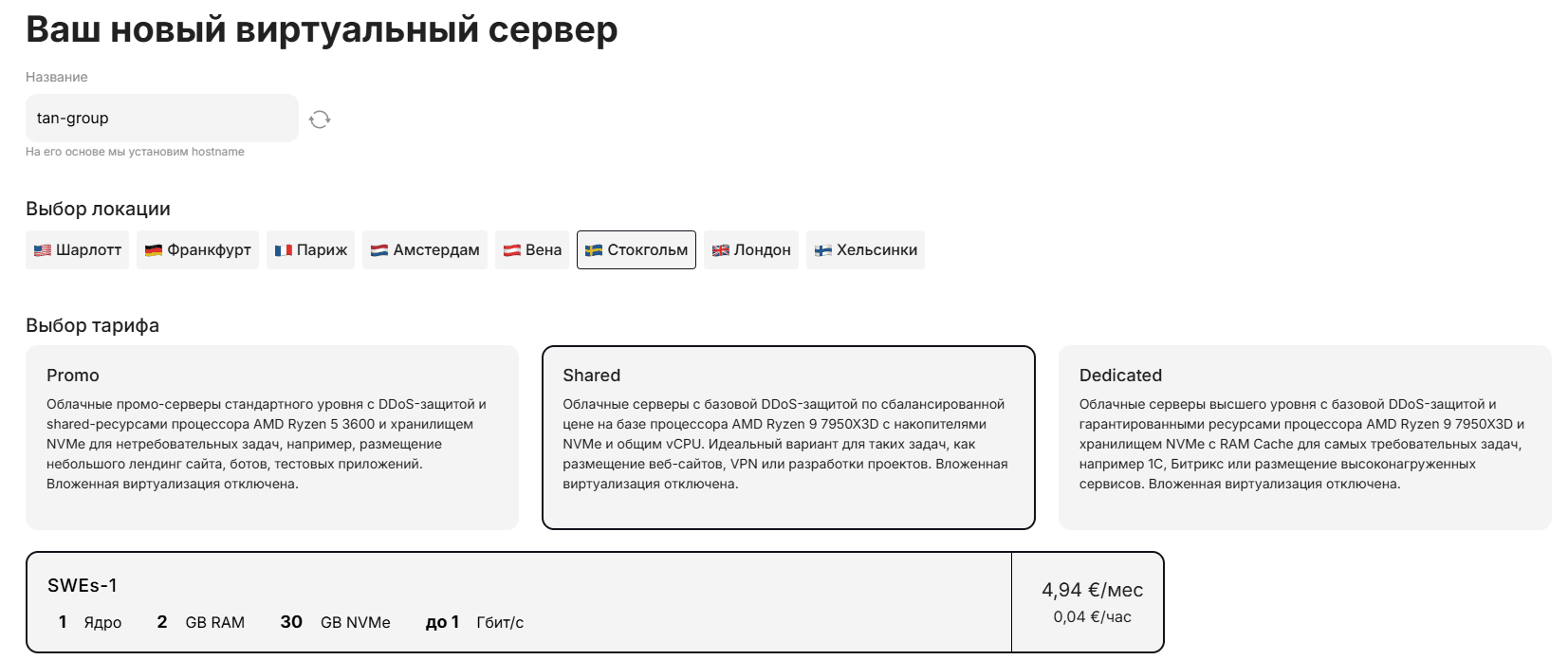 Для этого нам потребуется купить необходимый сервер в желаемой локации. В нашем случае это будет базовый тариф SWEs-1 в Швеции: